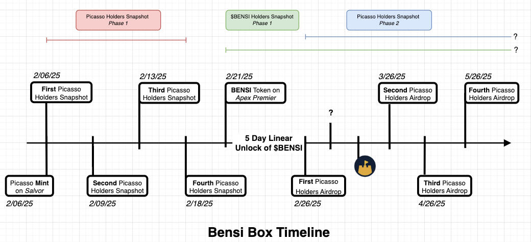 Bensi Box has take four unique snapshots of Picasso NFT holders. Each snapshot will be used to distribute 25% of the total Picasso NFT Holders Airdrop allocation.Foundation Tokens